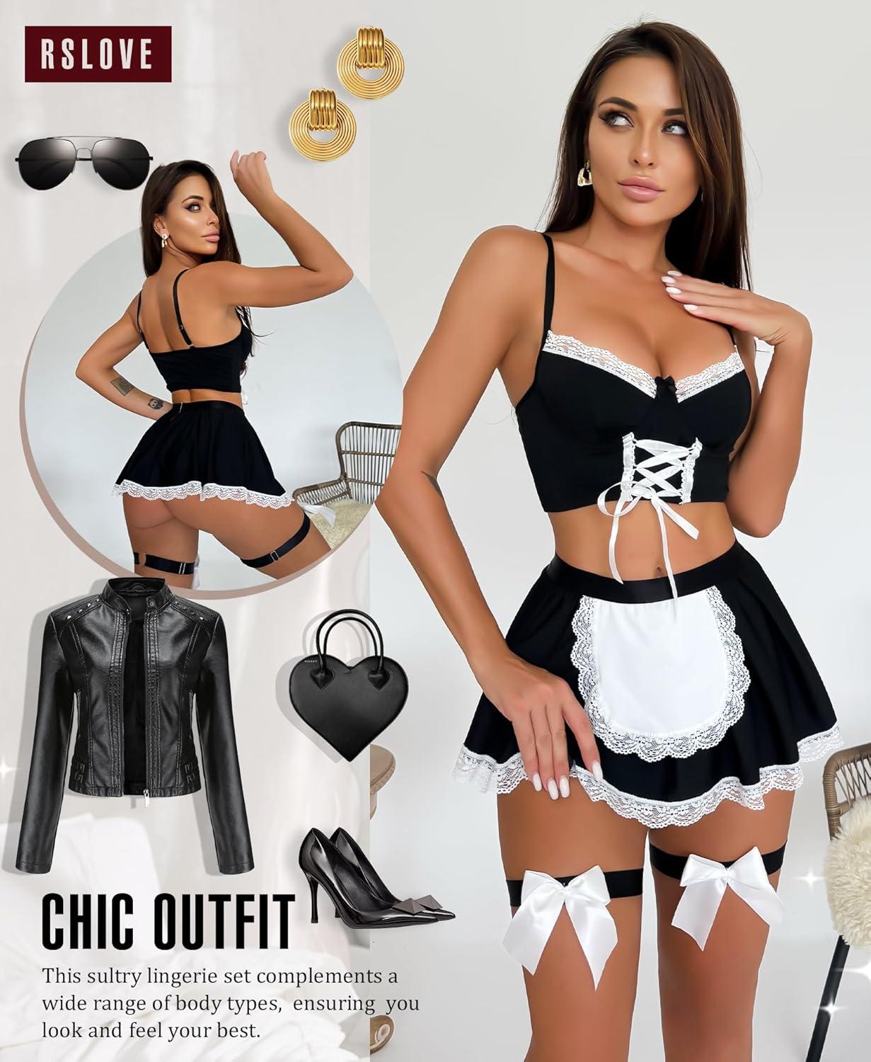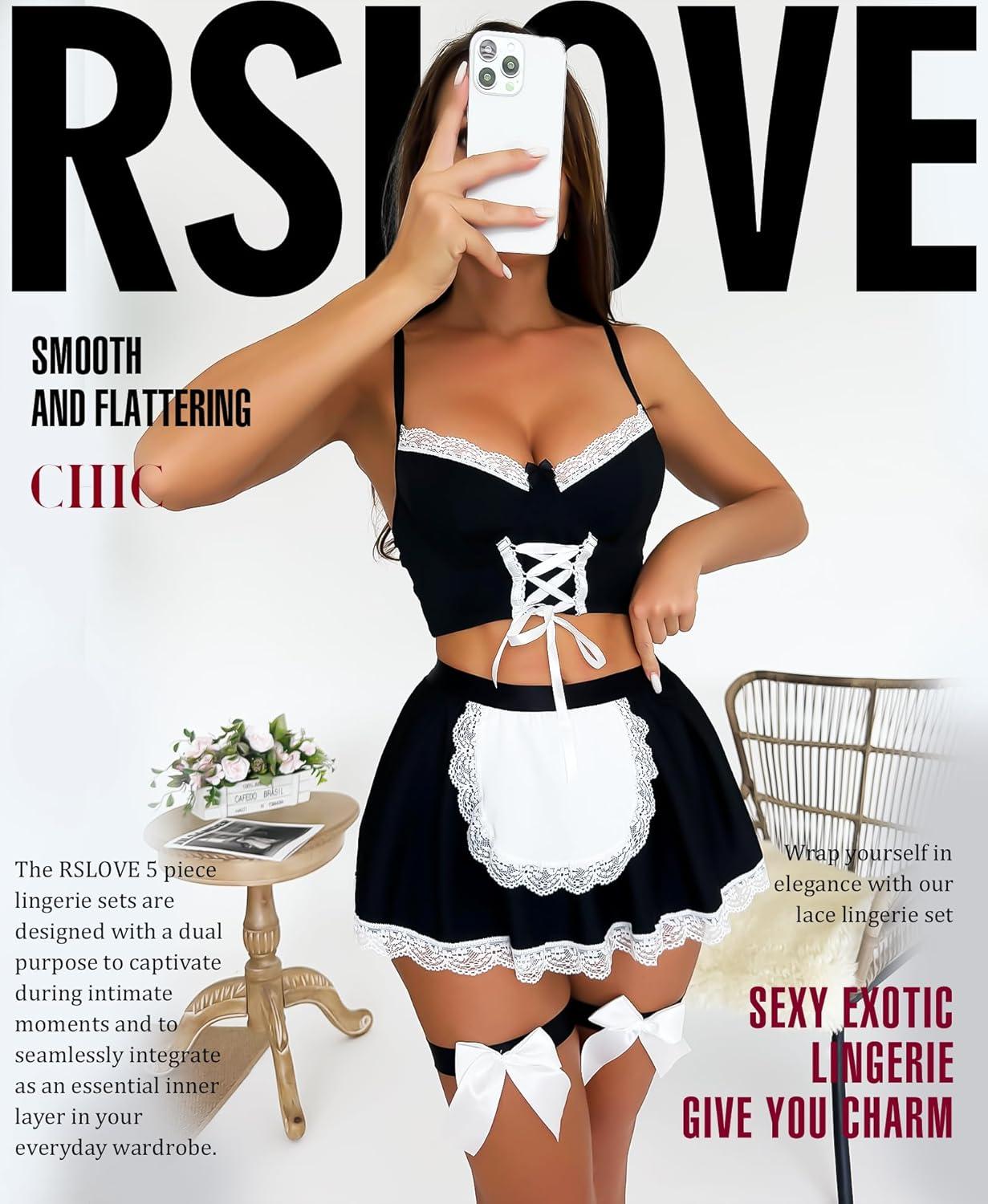 RSLOVE Sexy Womens Lingerie Set – 5 Piece Lace Babydoll Dress Exotic Lingerie Set Roleplay Costume(Black)